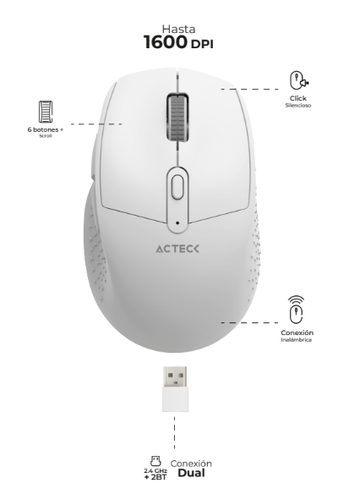 Mouse Optico Inalambrico Laser Acteck Optimize Ergo Mi680, 1600 Dpi, Click Silencioso, Receptor Usb, 6 Botones, Color Blanco