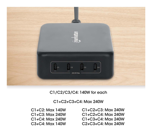 Cargador Manhattan 100 - 240 V, Teléfono Móvil, Computadora Portátil, Consola De Juegos Portátil, Smartphone, Tableta, Interior, 4usb-c, Carga Rápida, 240 W, Negro