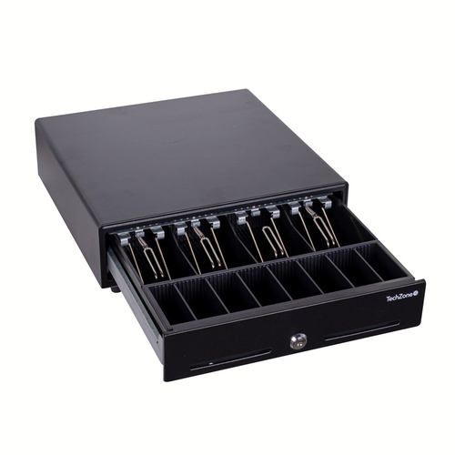 Cajon De Dinero Para Punto De Venta Techzone, Rj11, 4 Compartimentos Para Billetes Y 8 Para Monedas, Negro, (tzbe4b8m90)